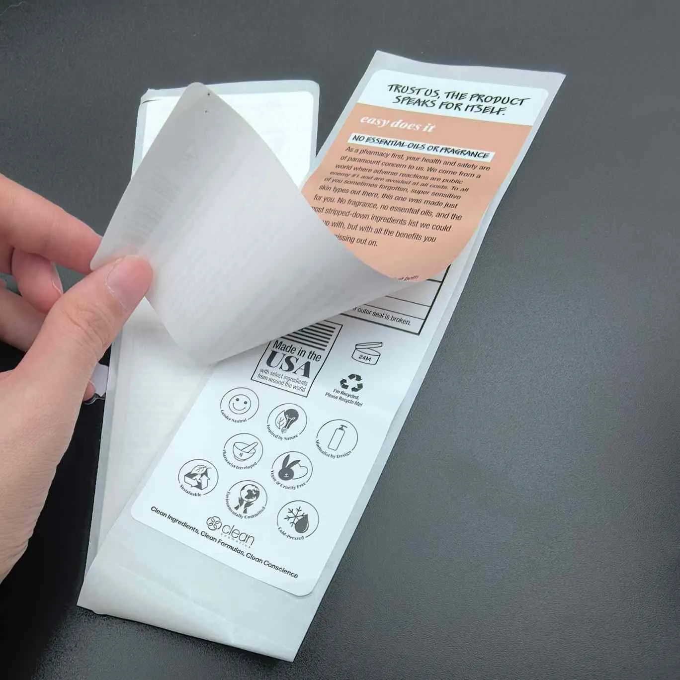 Peel and read labels: The most basic type, It is also called multiLayer for cosmetic labels The upper layer is easy to peel off, and the inner layer contains extended information. It is often used for facial masks, serums, and other small-packaged products.