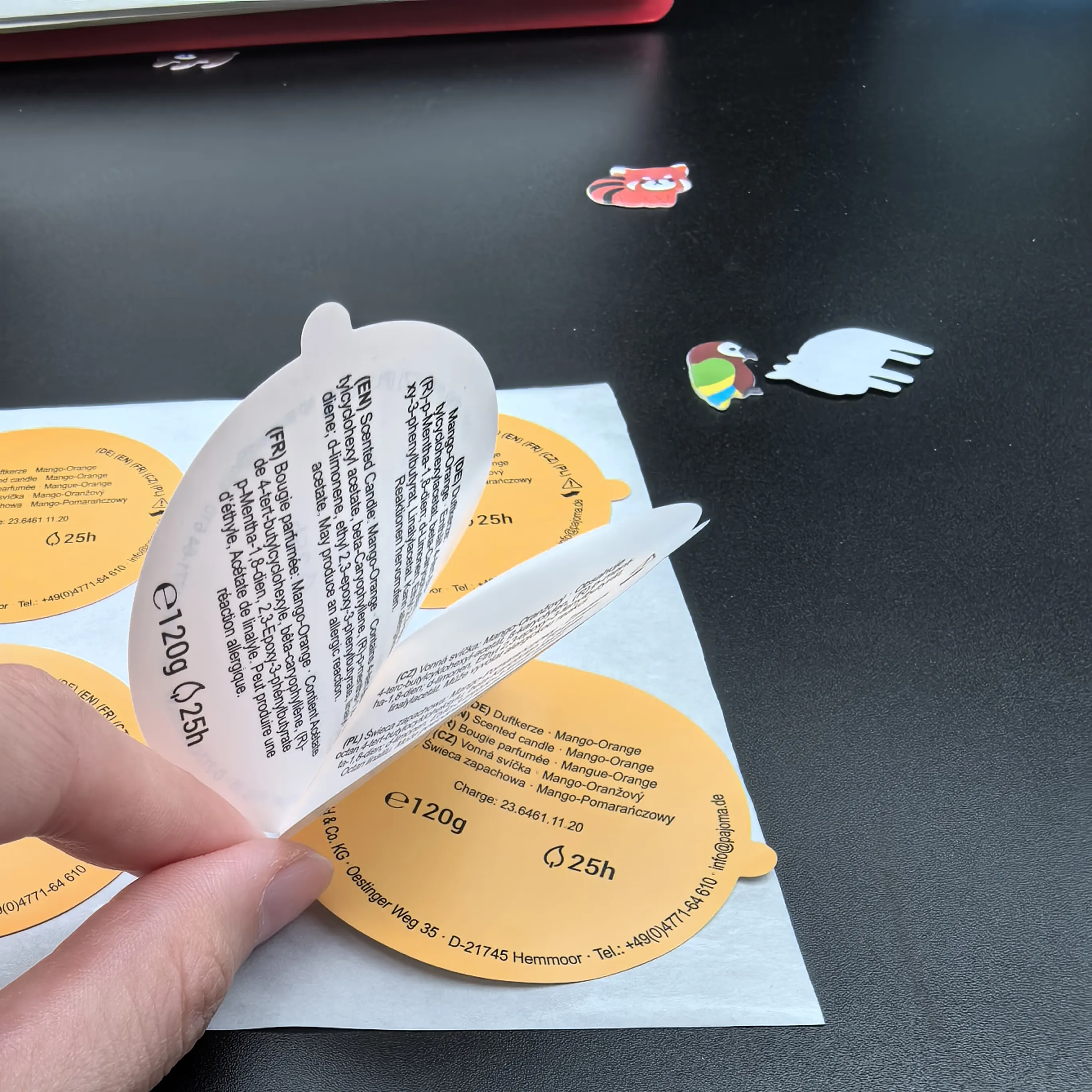 Folded labels are usually a long sticker with adhesive on one side and the rest folded. When unfolded, it looks like a mini booklet. When it comes to folded labels, the adhesive-coated bottom part is attached to the product, and then the upper part is folded over to cover it. Users need to manually flip it open to see the hidden information that is folded away.