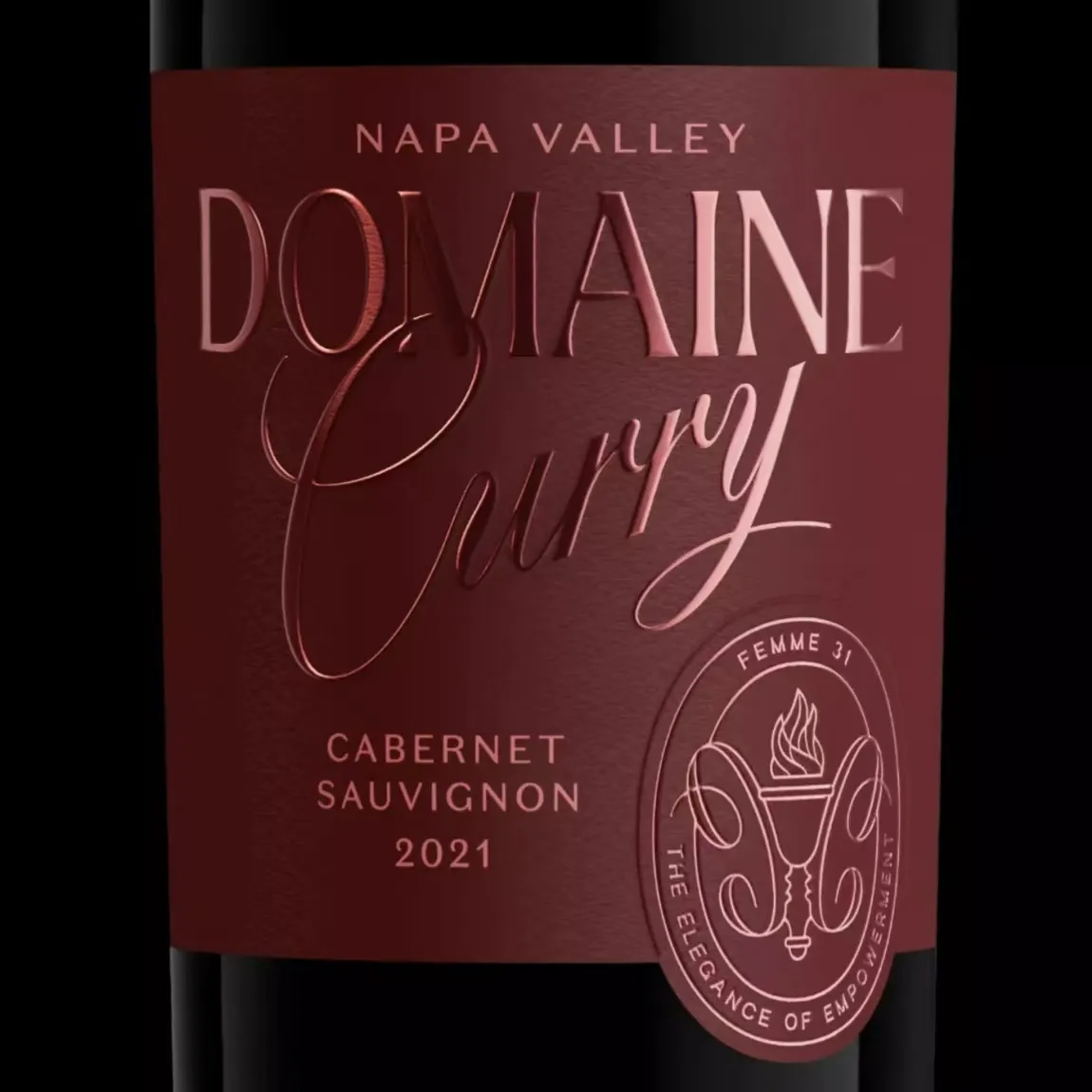 This wine label features extensive gold foil stamping. The black background is paired with golden line patterns, while the text uses a combination of gold and white. The brightness of the gold and the shine of the foil stamping, along with the slightly raised patterns and text, create emphasis and clear layering, giving a classic and elegant aesthetic.