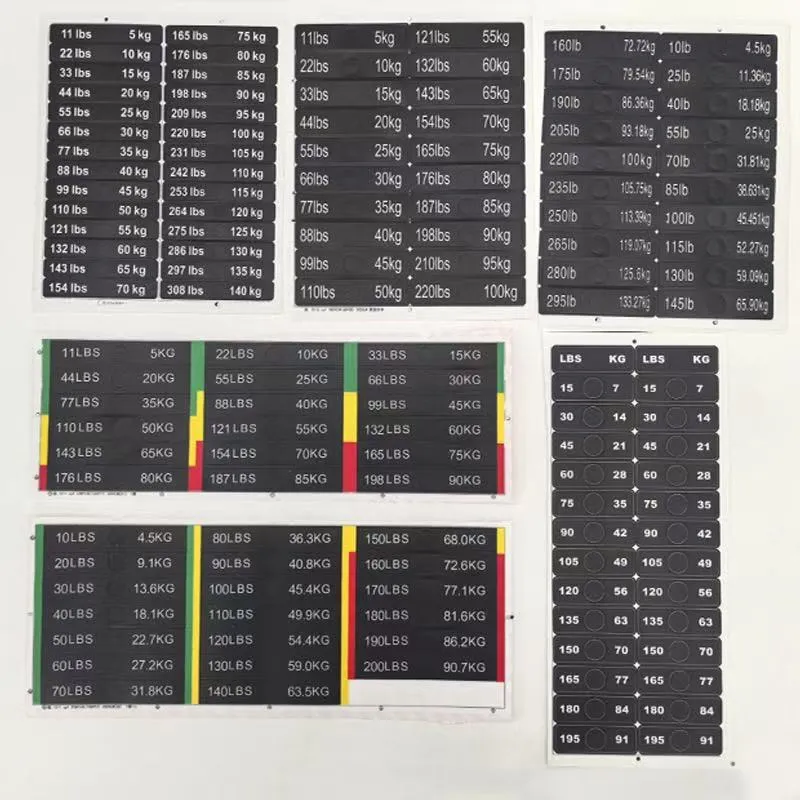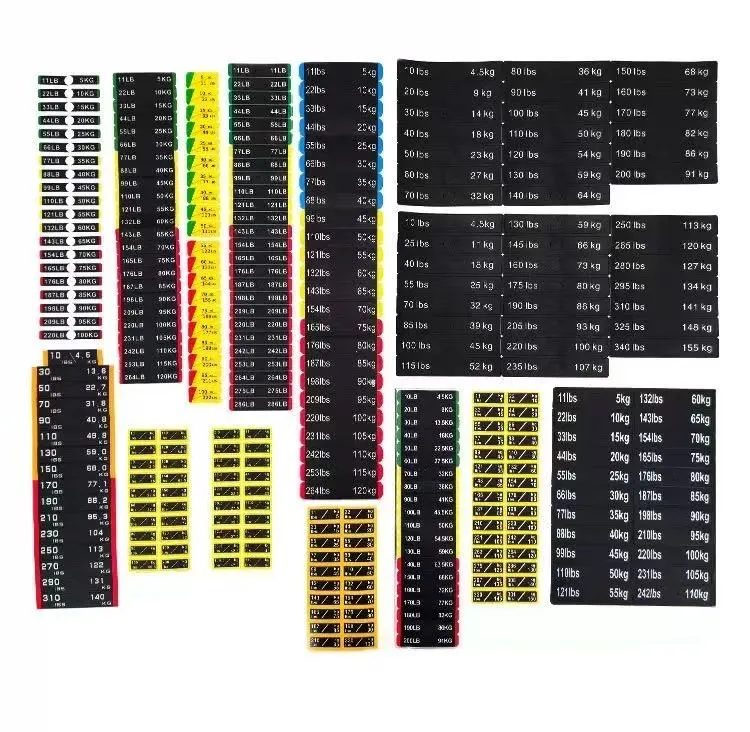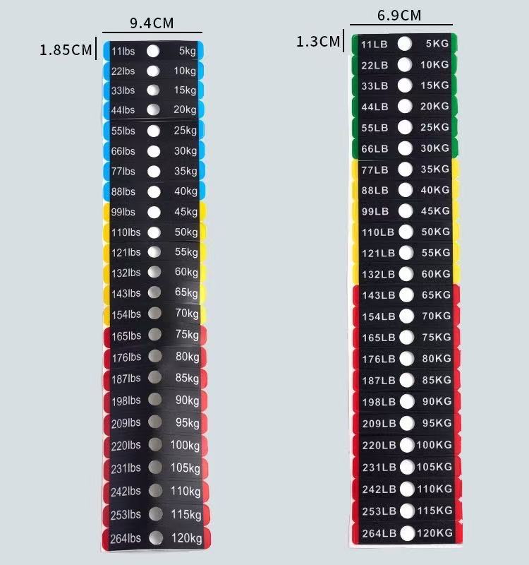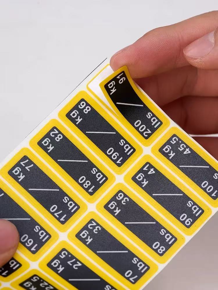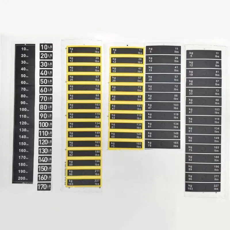 These weight stickers for fitness equipment weight blocks are a type of identification stickers specially designed for labeling the weight of fitness gear. They are usually made of PVC material, and you can refer to the product parameter table for specific dimensions. The weight values are clearly marked on the stickers, allowing users to quickly identify and select the appropriate training weight.